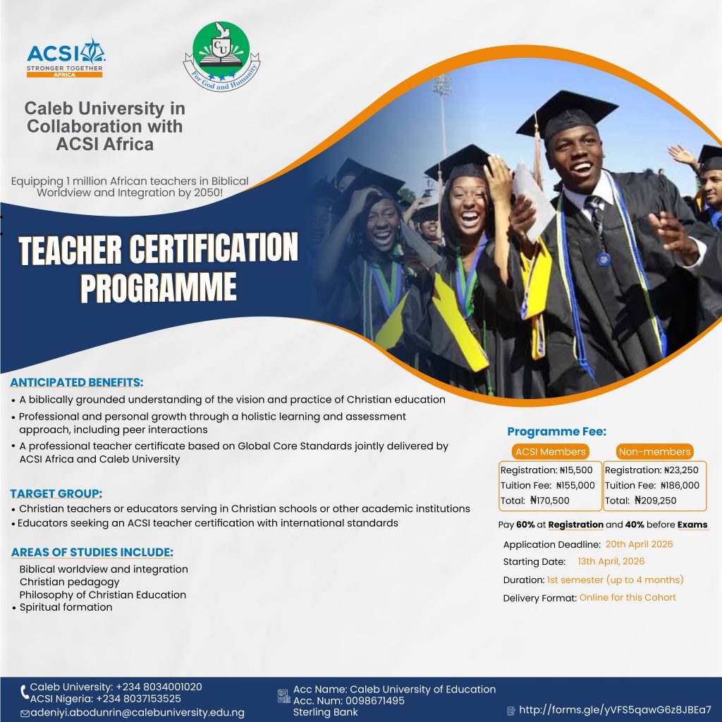 ACSI in partnership with Caleb University, invites Christian school educators and aspiring teachers to participate in our upcoming Teacher Certification Programme. This initiative is designed to strengthen the professional and spiritual capacity of educators who serve in Christian schools across the nation.