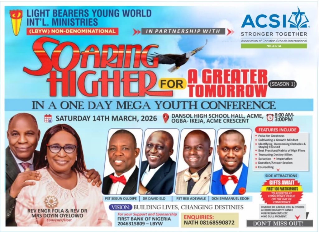 Light Bearers Young World Int’l Ministries (LBYW), in partnership with ACSI Nigeria, presents SOARING HIGHER (Season 1) — a power-packed gathering designed to equip, empower, and launch youths into a brighter future!